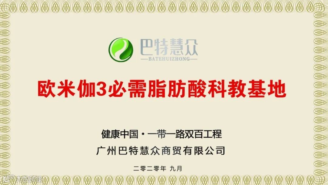 (Omega-3必需脂肪酸科教基地)是广州巴特慧众携手国际脂肪酸学会(ISSFAL)和健康中国新双百工程,在国际OMEGA-3健康理论新奠基人——阿蒂米斯.西莫普勒斯博士(ARTEMOS.SI-MOPOULOS),美国康奈尔大学汤姆.布莱纳教授(TOM BRENNA),康景轩博士以及哈佛医学院脂类医学技术中心博士后赵锋博士等专家的指导下,共同打造了广东省道个以OMEGA-3多不饱和多元脂肪为主题的健康知识科技馆。