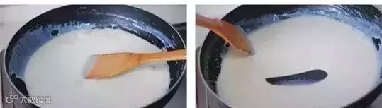 4、煮至变成浓酱程度,这时用刮刀搅拌可划出一条纹路,并且奶酱纹路能缓慢的收拢即可。