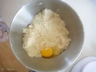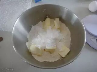 等羊奶放凉的时候可以开始做挞皮。黄油室温软化后放入面粉,再加入30克糖。