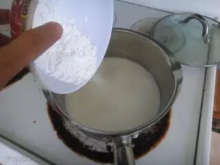 羊奶加温水冲好后,加入40克糖加热至糖溶解,离火放凉。