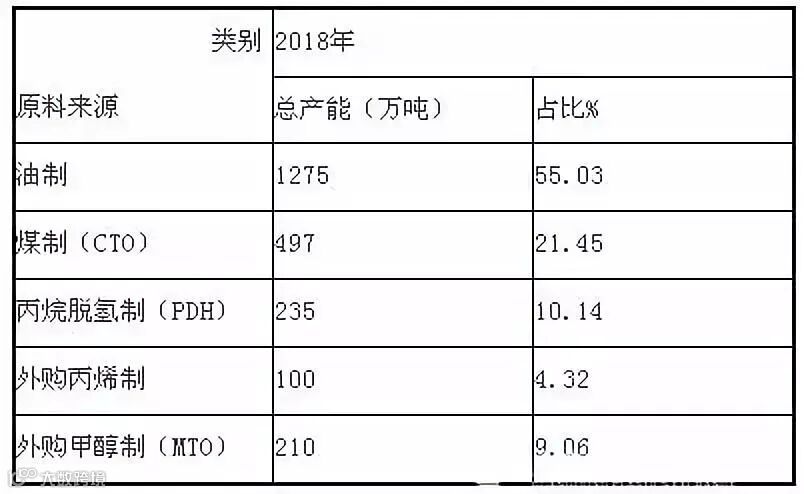 按照原料来源不同,具体分为油制、煤制(CTO)、外购甲醇制(MTO)、外购丙烯制以及丙烷脱氢制(PDH)。从表中可见,2018年油化工依然占据主导地位,上半年中海壳牌二期40万吨/年投产,合计产能增至1275万吨/年,占总产能的55.03%。其次是煤制烯烃即煤基甲醇制烯烃,下半年延长延安能化30万吨/年年投产,为煤制家族驻力新的力量;外购甲醇制、外购丙烯制以及丙烷脱氢制未有增加,总计产能545万吨/年,占总产能的23.52%。
