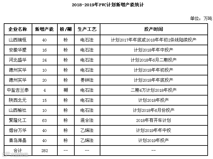 但是随着企业盈利状态好转,部分前期长期停车装置或投产推迟装置加快产能启动进程,并且还有一部分企业计划扩产,为此,卓创对2018-2019年PVC计划新增产能进行了统计,具体如下表: