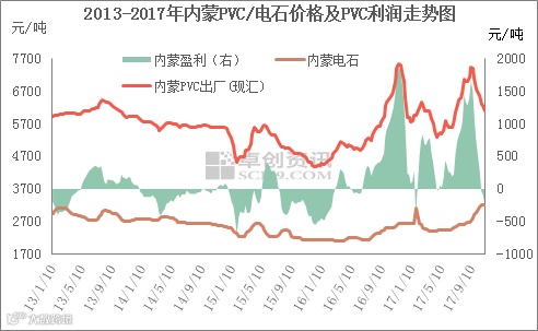 以内蒙地区为例,从上图可以看出,2013-5015年PVC整体盈利欠佳,亏损比较严重,2013-2015年PVC平均利润仅在-75元/吨,这主要是因为2013-2015年国内PVC市场处于一种严重供大于求的格局,企业竞争激烈,价格一直低位徘徊。2013-2015年PVC企业的日子并不好过,在PVC市场整体盈利不佳的大环境下,市场进入自动去产能过程,部分落后产能逐渐被淘汰,2013-2015年三年累积淘汰落后产能250吨左右。随着市场去产能化取得一定效果,2015年底开始市场供需逐渐平衡,企业盈利情况明显好转,2016-2017年内蒙地区PVC平均利润在485元/吨。