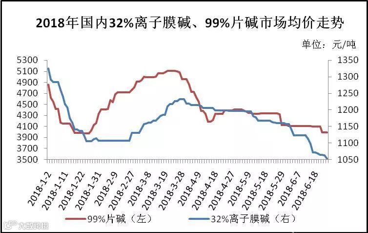 自今年4月以来,国内烧碱市场持续弱势运行,无论烧碱生产厂家封盘还是有意拉涨报价,市场反应都较为平淡,价格丝毫没有起色,甚至局部地区价格呈现缓慢下跌走势。截至6月25日,全国32%离子膜碱市场均价为1071元/吨,较3月30日下跌147元/吨,跌幅11.1%, 跌至2017年9月以来低位;99%片碱均价为4100元/吨,下跌860元/吨,跌幅17.7%,跌至2018年1月以来低位。