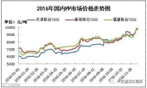 度过了寒冬,2016年国内PP市场暖流涌动,呈现阶梯式上涨的走势。全年有3波明显的涨势,第一波是3月份,PP装置检修小高峰期,供应减少导致的价格上涨,镇海炼化T30S价格由6500元/吨,涨至7900元/吨,涨幅达21.54%左右;第二波是6-7月,下游需求好转和PP期市的拉动,镇海炼化T30S价格由7000元/吨,涨至8400元/吨,涨幅达20%;第三波是四季度,欧佩克产油国8年来首次达成“冻产协议”,国际油价大涨,PP市场跟涨,镇海炼化T30S最高涨至9800元/吨。