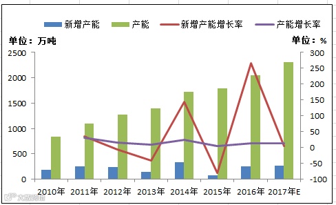 图1 2010年-2017年E我国PP产能与新增产能情况
