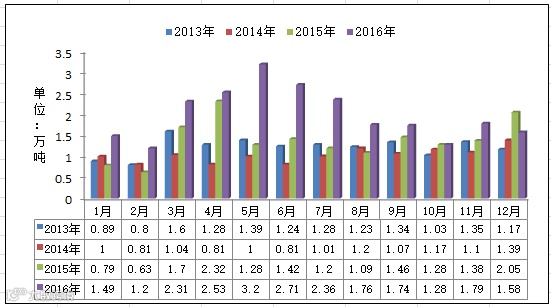 图2 2013年-2016年我国PP月度出口量对比图