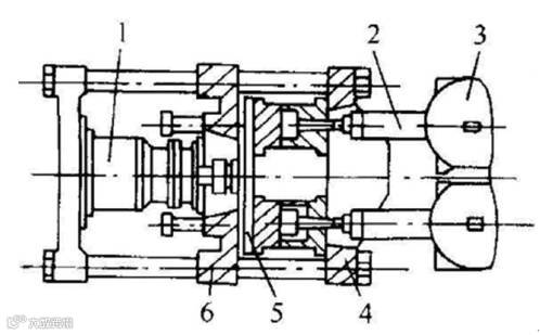 1-合模油缸;2-塑化注射装置;3-料斗;4-定模;5-模具回转板;6-动模