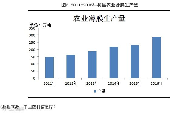 农业薄膜是地膜、棚膜等用于农业生产塑料薄膜的总称,其主要是有PE制作而成。随着大棚蔬菜等农业技术的普及,我国农膜产量逐年增长(见图3)。2016年我国农用薄膜生产量高达288万吨,占塑料制品比重为3.7%,占塑料薄膜的比重为20.2%。