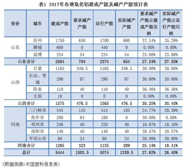 根据各地企业名单及各省氧化铝产能数据,广东塑料交易所统计得出,8省34市氧化铝要求减产产能为1503.5万吨/年,结合实际运行情况,实际减产产能为1339.5万吨/年,具体数据如表1所示。