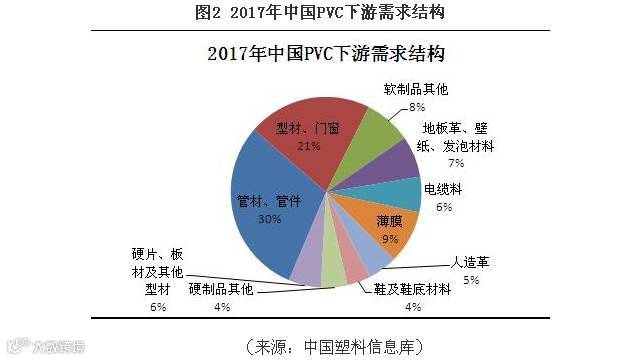 目前,PVC硬制品和软制品的使用比例约为6:4,达到世界平均水平。而从2007年起,因房地产市场迅速发展,管材、型材等制品成为了PVC消费的主要增长点。从38.5%增长至56%,2013年最高触及64%的占比。但之后因国家房产调控政策加码,国内塑料型材产量呈现负增长,管材、型材的比例亦出现小幅回落。近年受到了政府减少基础设施支出和房地产市场衰退的影响,管材、型材需求暂未有太大改善。由图2可见,管材、管件和型材、门窗仍是中国PVC消费的最主要终端,合计消费比例达到51%。