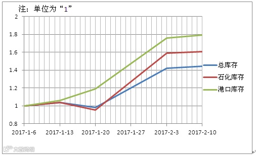 供应端来看,据统计显示,农历春节后国内石化企业PE总体库存出现明显累积,环比2016年12月库存增长超过67%,据笔者了解,华北齐鲁石化过年期间依旧高负荷生产愈万吨烯烃类产品。另外由于下游需求冷清,出货阻力加大,贸易商库存也出现增长,涨幅在5%以上。PE港口库存环比增长48%,主要原因是受春节假期运力减少的影响,多数货柜出港困难,部分港口甚至爆满。当前市场货源充足,2月初价格坚挺主要是因为货源集中,上游对后市比较乐观,所以挺价销售。但是到了二月中旬,伴随着下游开工季的到来,需求增长并未及预期,加之港口库存飙升,所以价格向下调整幅度剧烈。
