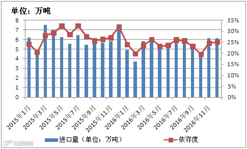 2016年1-11月进口量累计58.419万吨,较去年同期减少7.451万吨,降幅11.31%。其1-11月的进口依存度为23.38%,较去年下降4.03%。与此同时,国产料产量略有增加。从这可以看出,国内产量逐渐释放对进口料的替代作用在增加。