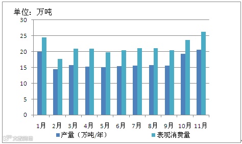 图4.2016年1-11月产量和表观消费量走势图