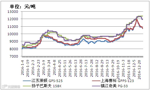 纵观过去十年PS市场价格走势,12月底PS价格处于相对高位。莱顿525 12月30日价格为10700元/吨,虽然收复了2015年的跌势,但从全年行情走势来看,PS高位价格并不稳定,年末价格快速回落,年内均价仍处于9180元左右的低位。