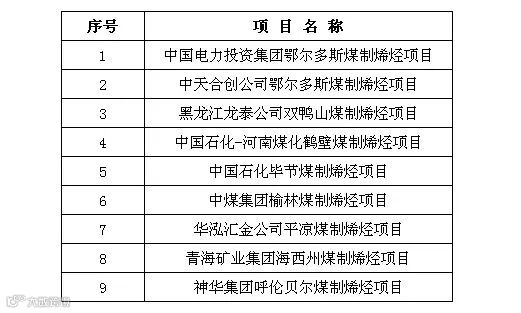 煤制烯烃升级示范项目表