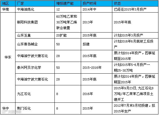表1.2015-2016年国内苯乙烯装置投产计划统计表