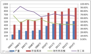 截至2015年11月,我国苯乙烯产能达到785.4万吨,然而2014年我国苯乙烯市场需求已经逼近900万吨,苯乙烯供不应求的现象依旧存在。从上图可以看出,近十年国内苯乙烯产能不断增大,但对外依存度一直维持在40%以上。造成这种现象有两方面原因。