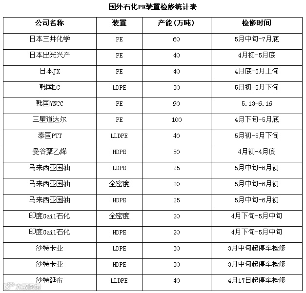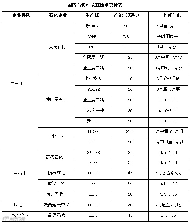 3月份之后,国内石化装置普遍进入春季集中检修期,据广东塑料交易所统计,二季度国内PE石化企业装置检修涉及产能达500万吨,占国内石化总产能的30%,月均减少产量约达25万吨,市场货源供应的减少,势必对国内PE市场带来利好支撑,对石化价格维持强势提供动力。