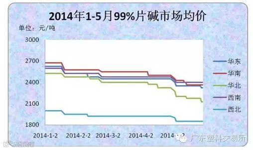 国内片碱市场较之液碱市场价格跌幅及振幅更大。春节假期归来后,北方大量片碱货源南下,囤积在南方的码头、港口、仓库,饱受库存压力下,市场出货成为难题,厂家和贸易商纷纷降价促销,迫使片碱价格大幅下滑。华北地区99%片碱价格从年初的2500-2600元/吨4-5月份降至2100-2200元/吨,西北地区则从2000-2200元/吨降至1800-1900元/吨。尽管降价的厂家之多幅度之大,但并没有改变市场低迷的格局,下游接货持续没有改善,商家普遍观望的氛围加剧,甚至5月份氯碱企业集中检修的利好也仍未能扭转这种颓势。