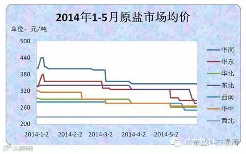 2014年,受下游两碱行业市场低迷,及国外低价进口盐冲击,我国原盐市场整体行情也难有起色,盐价在3月和5月出现了两个下行拐点,国内原盐均价在250-300元/吨左右。