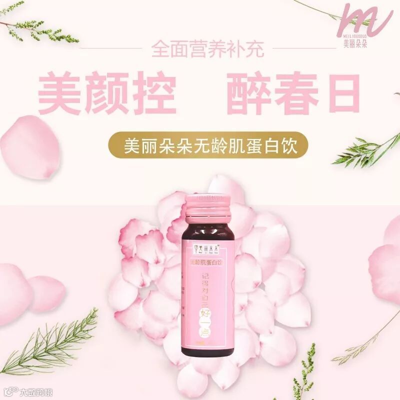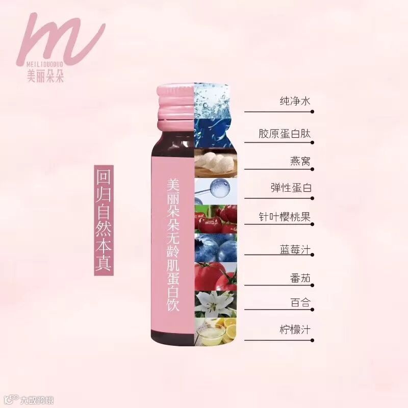 美丽朵朵无龄肌蛋白饮采用高质量大西洋深海鱼胶原蛋白肽、燕窝,针叶樱桃果,蓝莓汁,番茄,百合,柠檬汁,零添加低脂肪,有一种安心加【健康配方】