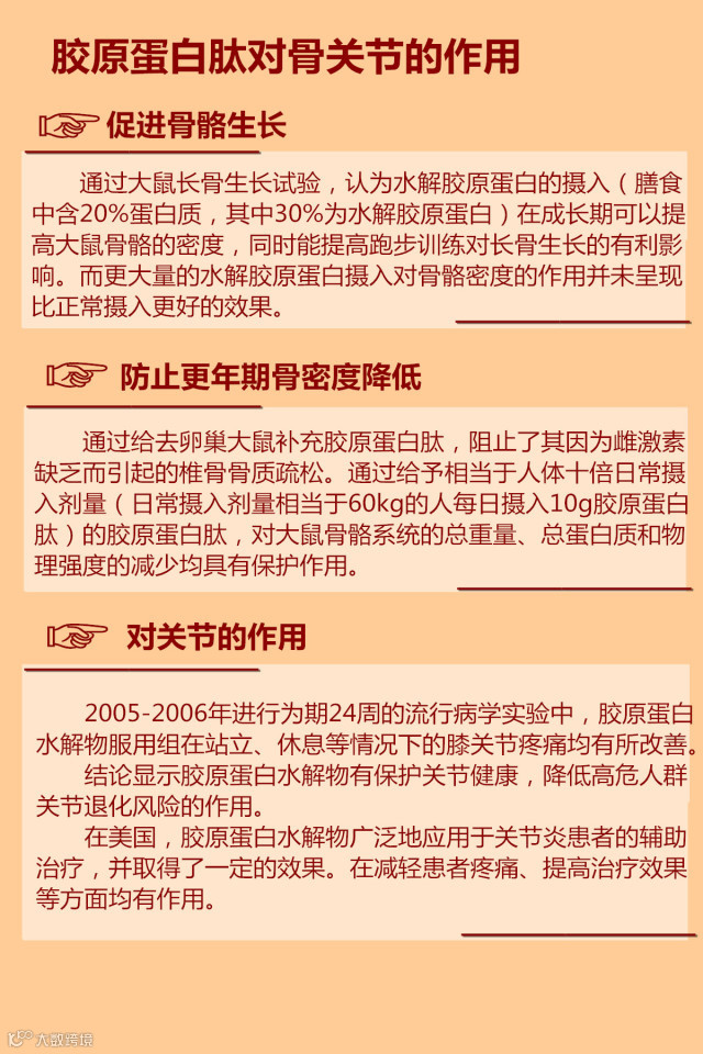 近年来,胶原蛋白肽的研究已引起人们广泛重视,如抗氧化性,抗菌活性,降脂效应,免疫调节活性和对皮肤、骨骼和关节的有益作用,其独特的生理功能和物化特性成为国内外研究的热点。目前胶原蛋白肽已经被广泛应用于制药业及保健食品业,作为改善皮肤和软骨组织的食品补充剂。 |