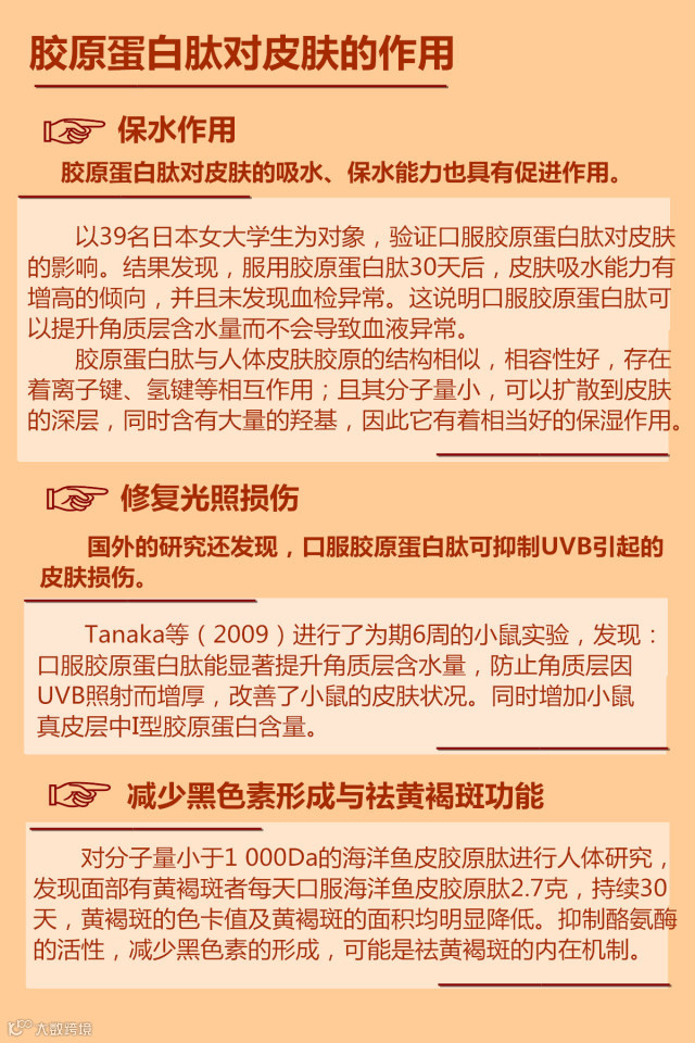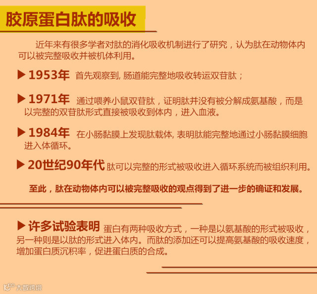 | 嗯,原来,胶原蛋白肽是可以直接被肠道吸收,进入血液,到达皮肤、肝脏、肾脏等身体各个部位的,那么它所具有的功效就能被人体吸收。 |