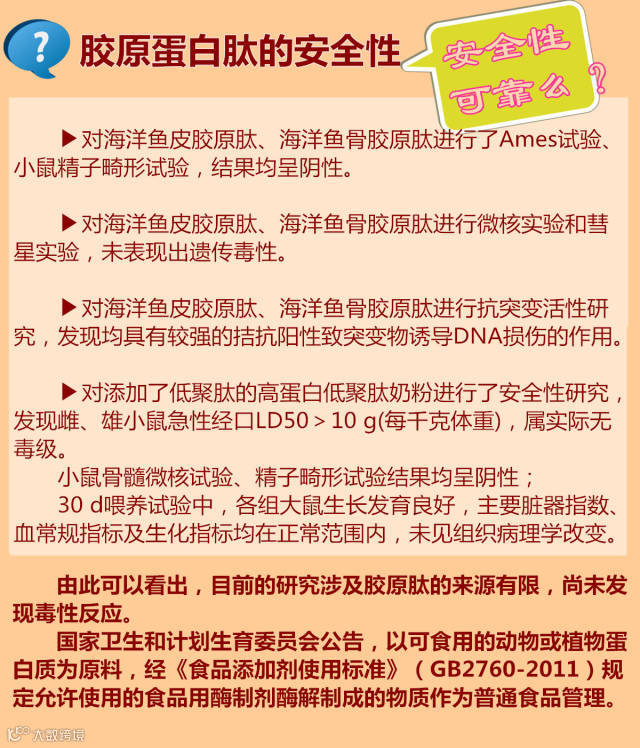 美国食品药品监督局(FDA)食品安全中心关于胶原蛋白安全性声明中称,胶原蛋白产品作为药品和食品成分对人体是安全的[29]。