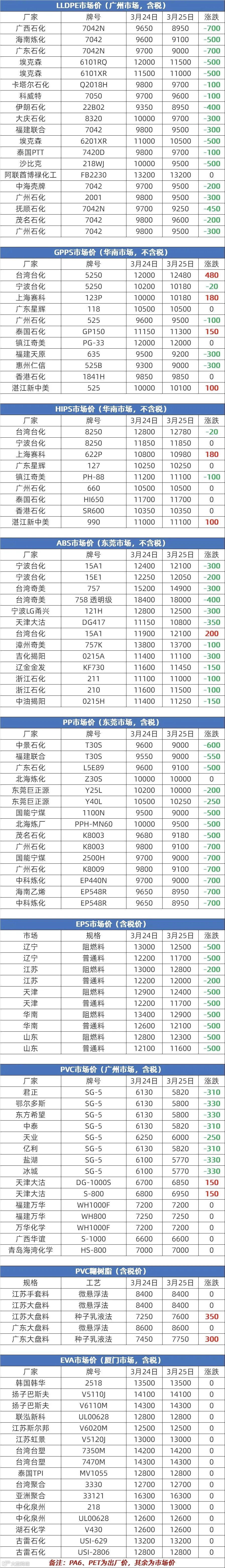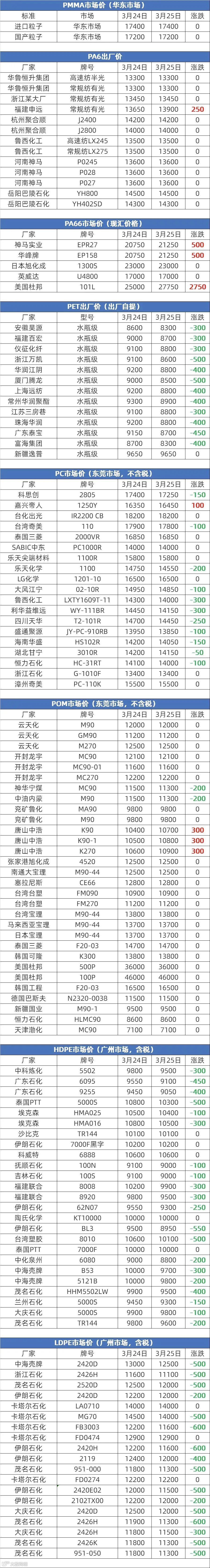 3月25日塑胶原料报价