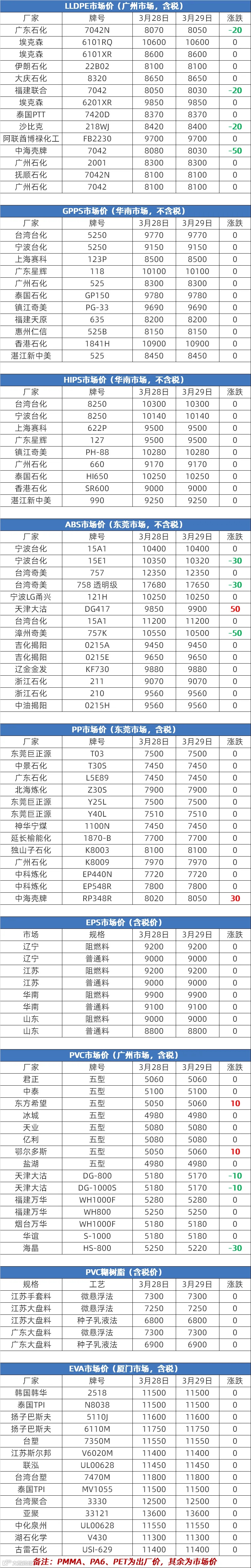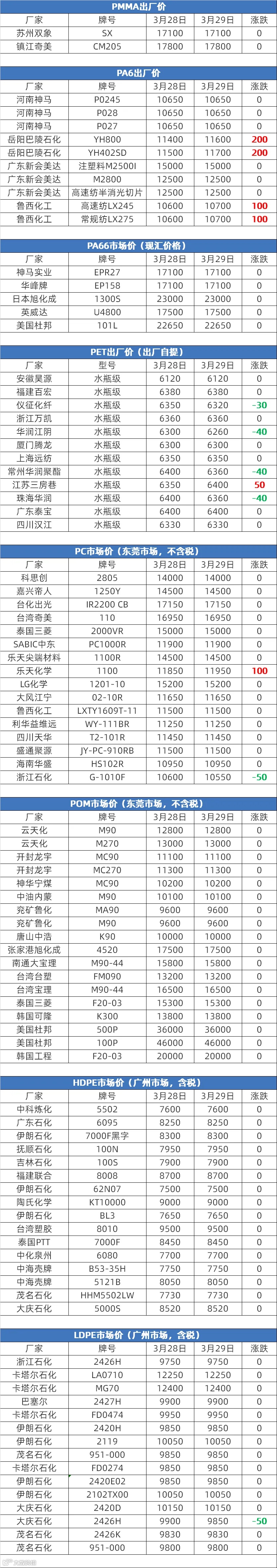 3月29日塑胶原料报价