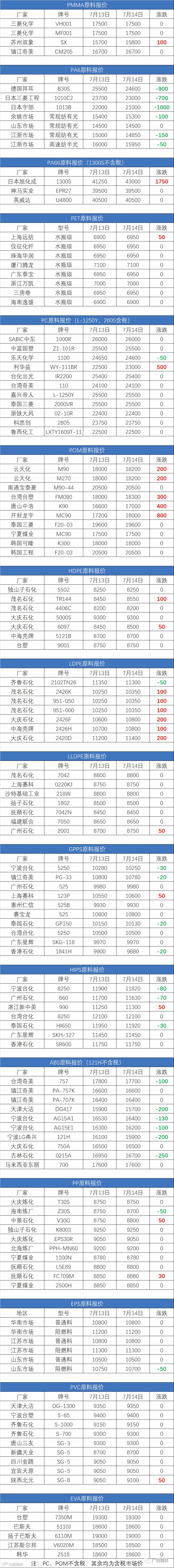 7月14日原料报价