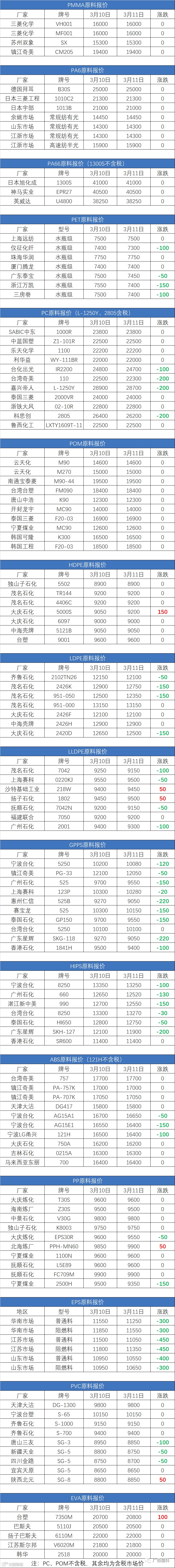 3月11日原料报价