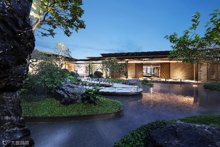 绿城·揽江印月以岭南四大名园“余荫山房”为设计原点,提取空间序列,贯穿文化内涵,借广绣“精巧纬法”,取山房胜景入园,浓缩岭南山水,呼应一线江岸,以层次丰富的空间序列营造沉浸式的岭南美学天地。