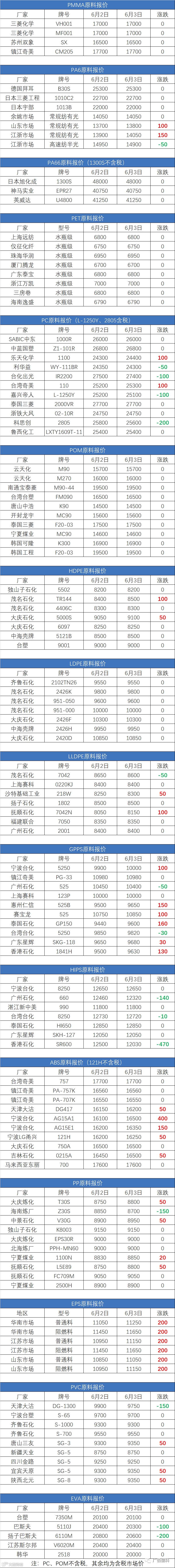 6月3日原料报价