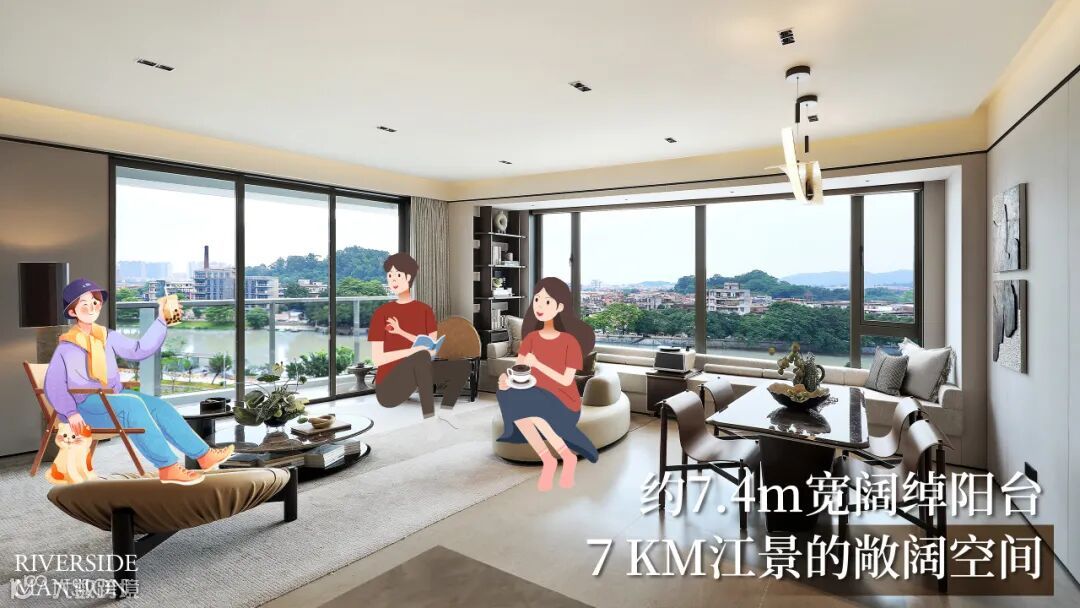 约7.4m宽、1.7m进深阔绰阳台,为居住者打造一个可以容纳眼前7KM江景的敞阔空间。
