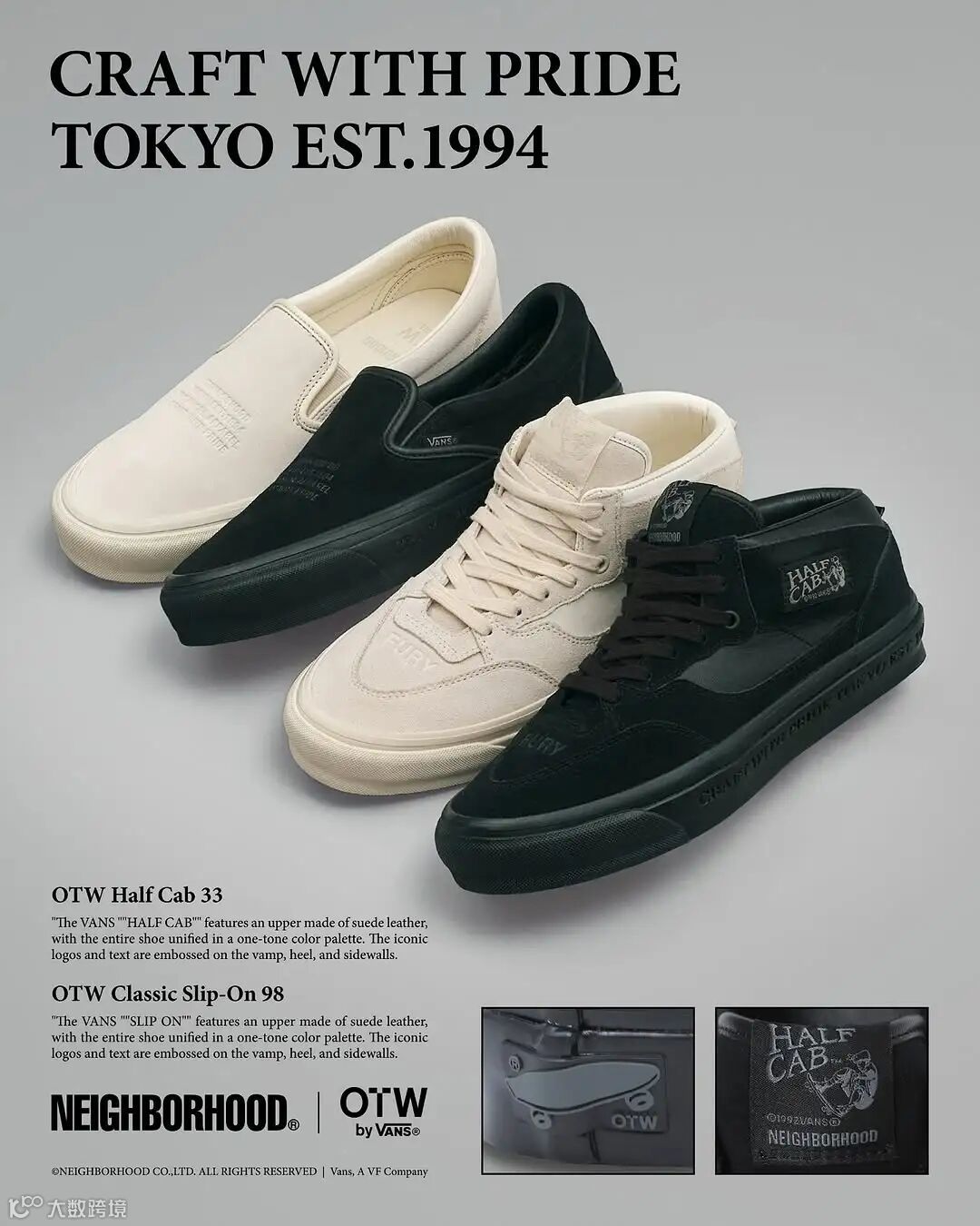 OTW by Vans 高端支线携手 NEIGHBORHOOD 推出第六次联名,此次联名以 Half Cab 33 与 Classic Slip-On 98 两款鞋型为载体。将优质麂皮与皮革材质融入经典鞋型设计,辅以同色系缝线收边,在简约之中,隐含精致锋芒。