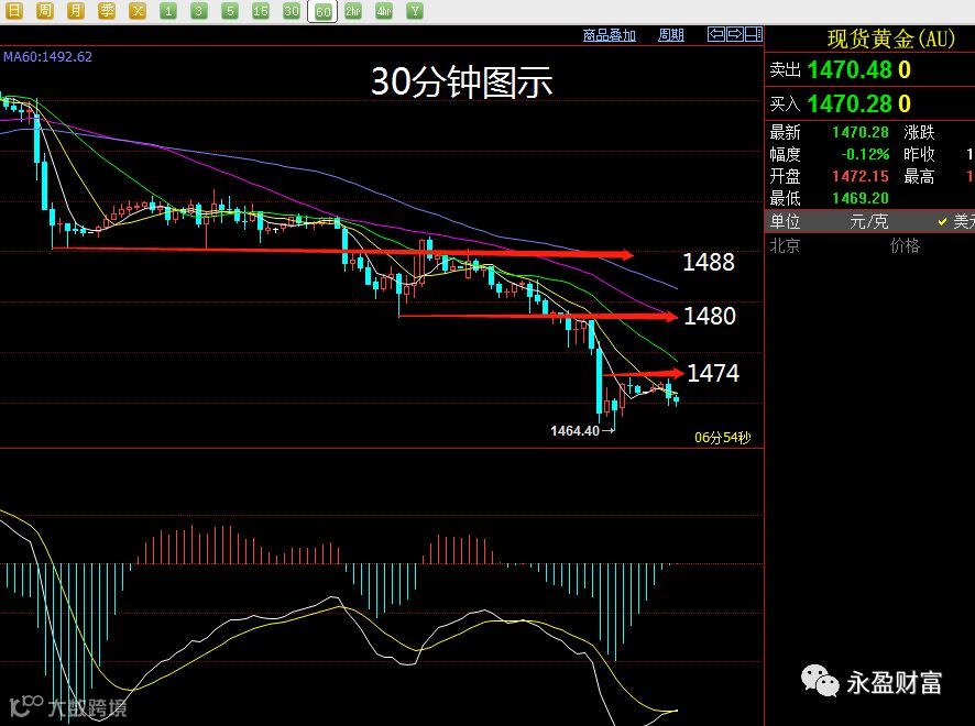 短线方面:我们今天选择是30分钟的图示盘面作为讲解,可以把有效的价格筛选出来。1488-1480-1474的3个位置,我们贯彻上文的思路。下跌盘整之后再下跌。目前的价格压力在1474的,这个是我们今天介入做空的价格。因为短线是维持下跌区间修复来对待,所以今天的白盘是围绕1474-1465的区间做交易。如果破位上涨,还得空。