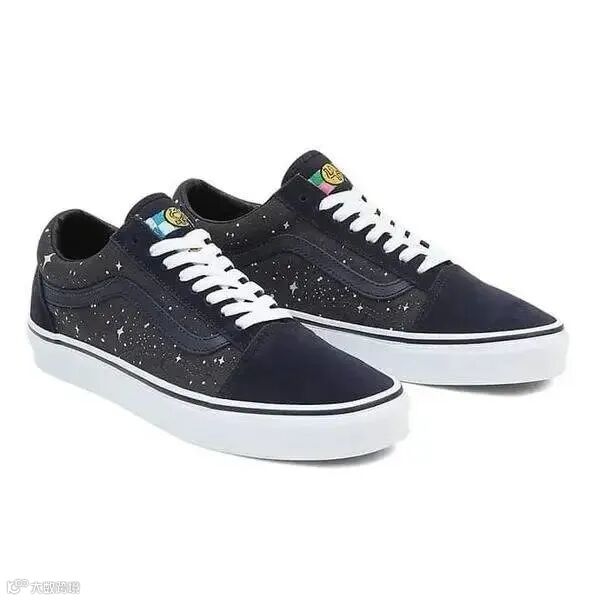 Old Skool 鞋的大部分以的星星图案代表美少女们各自的守护星,鞋的头部和跟部则使用藏蓝色麂皮材料,鞋身以黑色帆布为主,后跟处点缀着月亮标志的刺绣