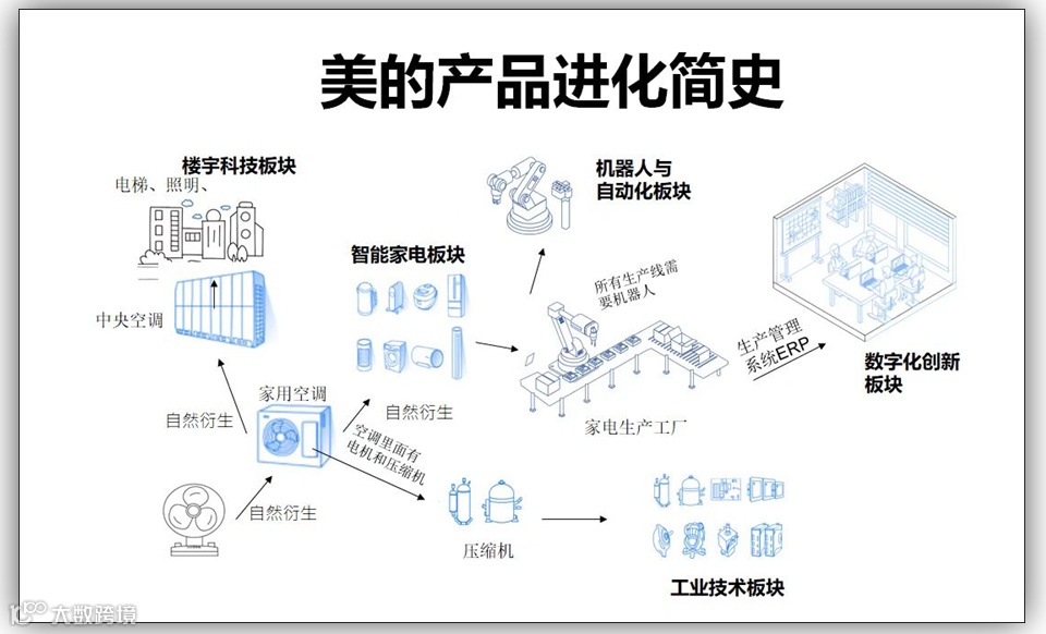 在这张图里可以看到,美的沿着最初的风扇产品,在白色家电制造的战略主航道内,不断进化发展,最后呈现出今天的五大业务板块:智能家居板块、楼宇科技板块、工业技术板块、机器人与自动化板块、数字化创新板块。