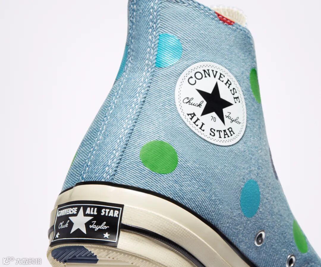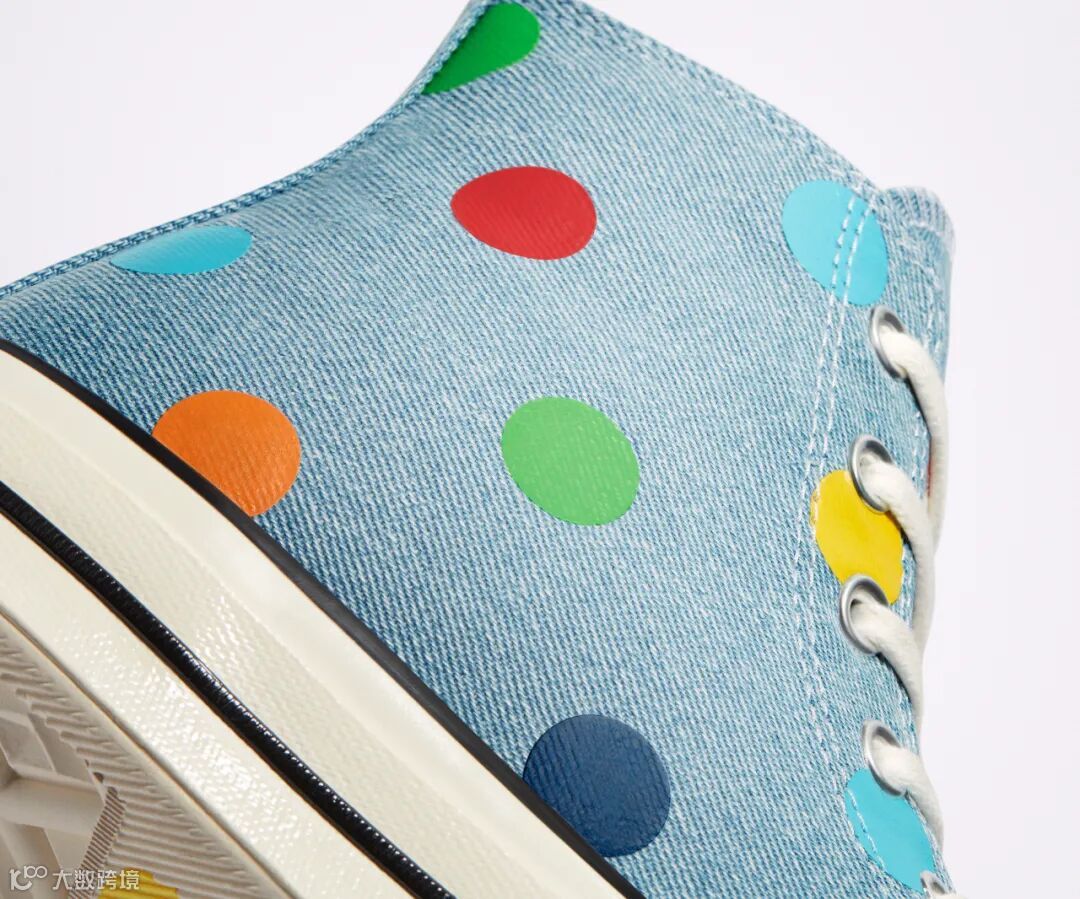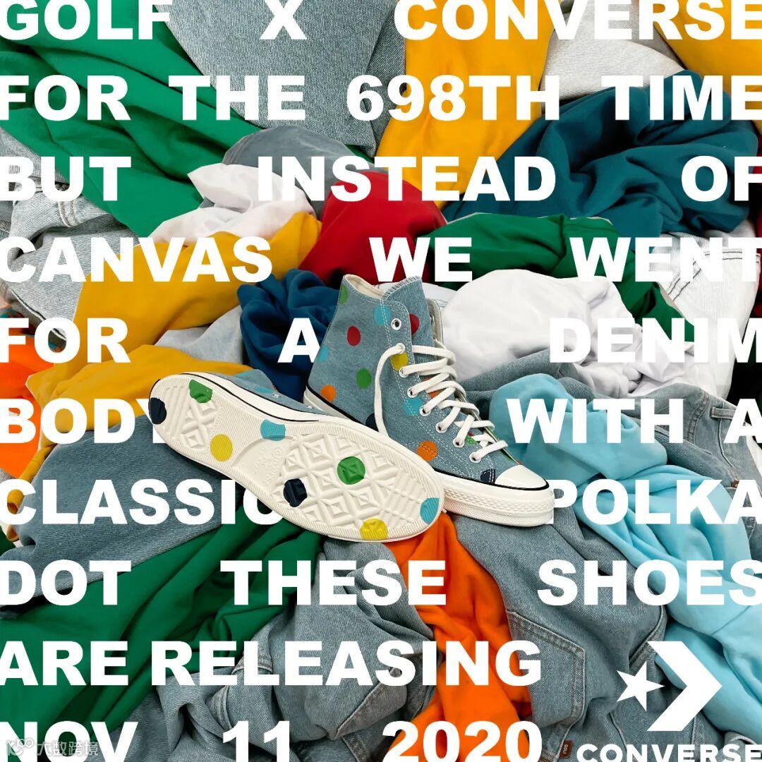 高端细致的工艺遇见跳脱常规的设计,大胆玩趣的GOLF WANG全新联名款Chuck 70诞生。Converse与Tyler, The Creator一起打造一场波点梦境,水洗感牛仔与彩虹波点的组合,演绎属于波点的幻奏曲