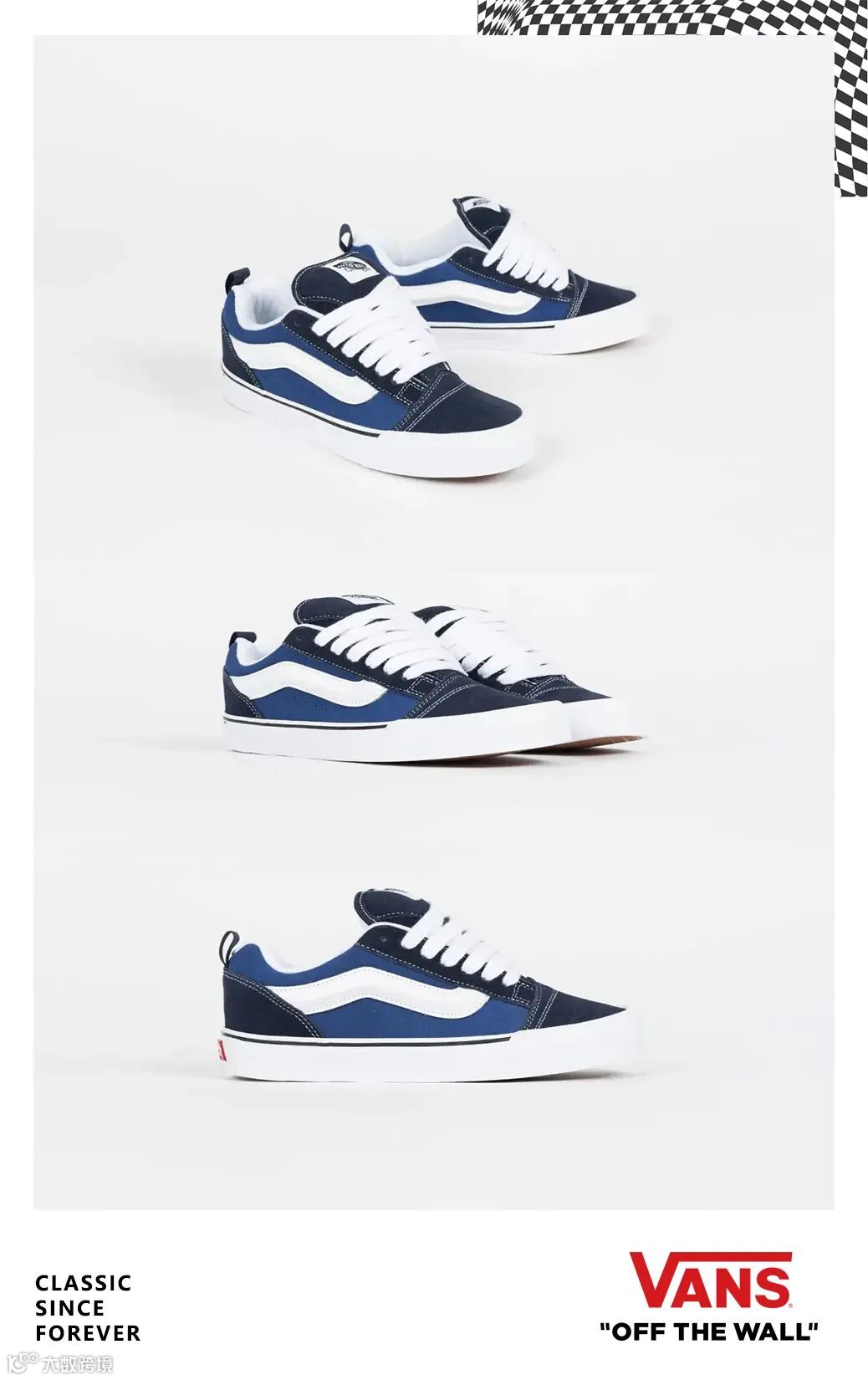 此次,Vans Knu Skool 面包鞋经典系列释出两款配色方案,保留黑白经典配色的同时,另囊括一双由深蓝与浅蓝色拼接而成的鞋款。