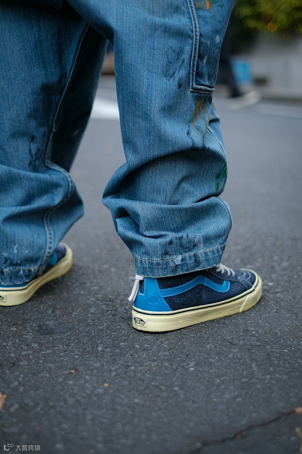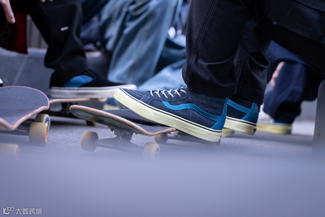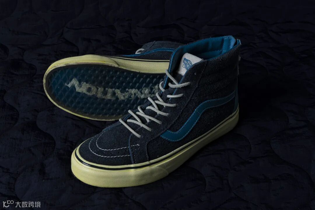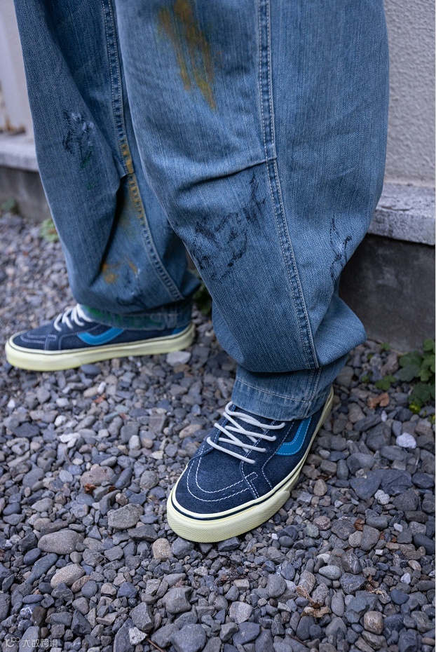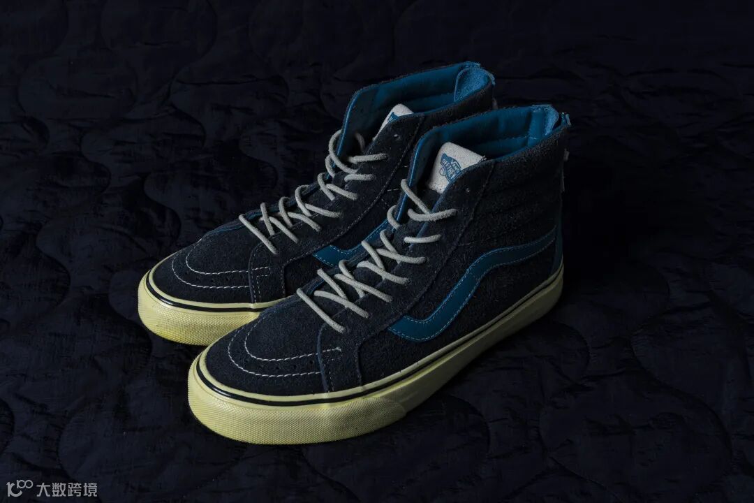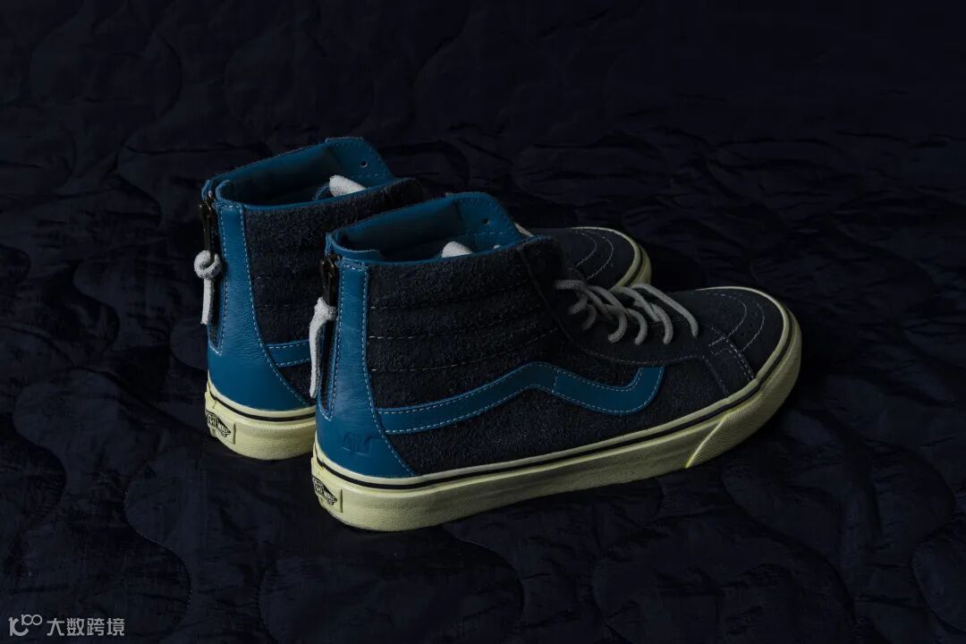 Sk8-Hi Reissue Zip 侧边条纹和鞋后跟使用蓝色光滑皮质搭配海军蓝鞋身,后跟处压印千纸鹤图案,彰显联名属性。