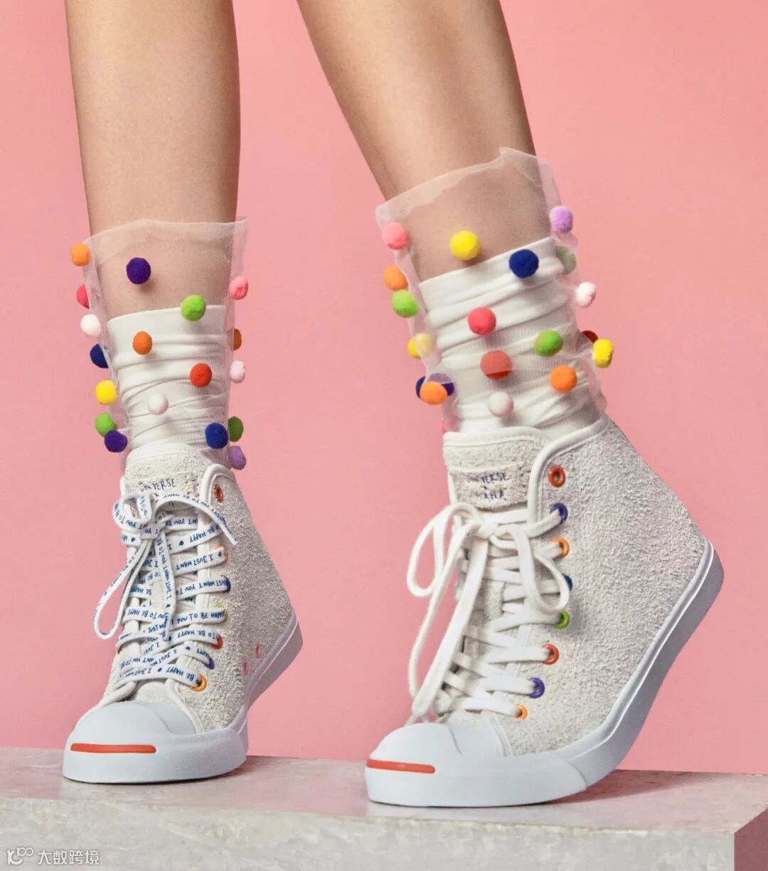 纯净米色系的反毛皮鞋身,娜娜亲自手绘印花的可爱鞋内里。一面代表的是她创作时的坚定专注,而另一面则是她内心世界的童趣天真,同时搭配五彩缤纷的鞋孔配色,印有“I just want you to be happy”的可替换鞋带。