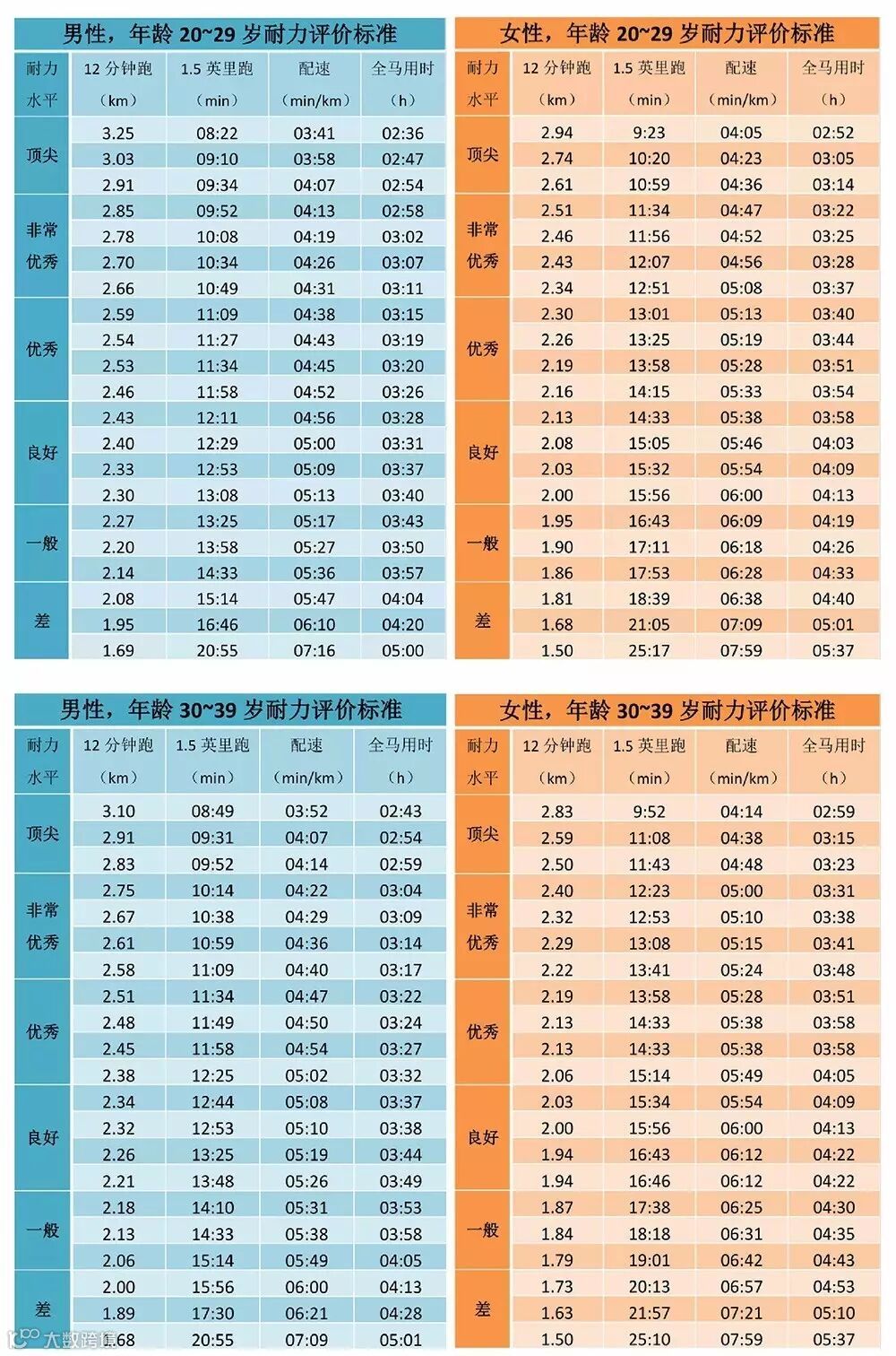 许多跑者在跑步中最关心的就是自己的配速,配速高低意味着耐力好坏,也意味着跑步能力的高低,配速是跑友们交流的语言,也是彼此讨论的热点。国际标准耐力评价表制订了12分钟跑和1.5英里(等于2.4公里)跑的评价标准,大家可以亲自测试12分钟跑或者1.5英里跑的成绩,从而获得自己的配速和耐力水平。不同年龄段男女配速参考: