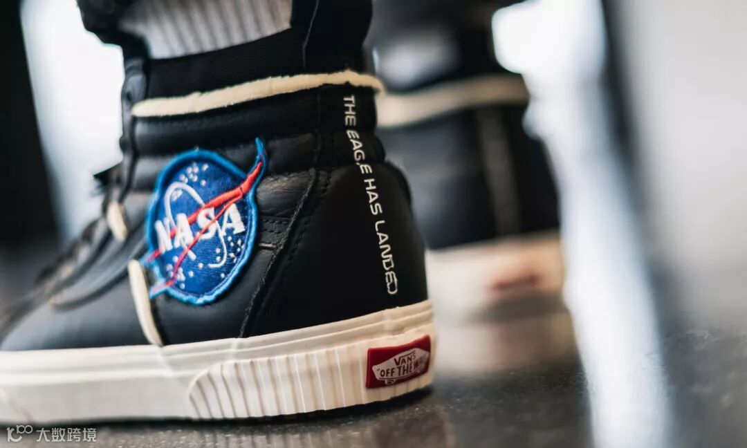 除了 Old Skool 侧面 NASA Logo 及其全称外,两双 Sk8-Hi 后跟还有 "THE EAGLE HAS LANDED FOR THE BENEFIT OF ALL" 的字句,以此向当年阿波罗 11 号登月第一人的阿姆斯特朗致敬。