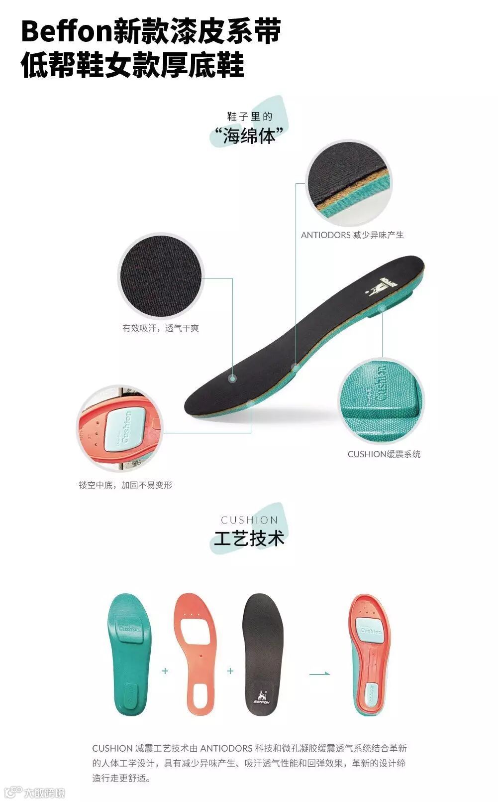 炫彩漆皮鞋面,时尚大气。手工缝线加固鞋身,于细节处彰显Beffon品质。5.3cm厚底鞋跟,穿着修长身型,也更为舒适。本款鞋采用的鞋垫技术也让人赞叹。