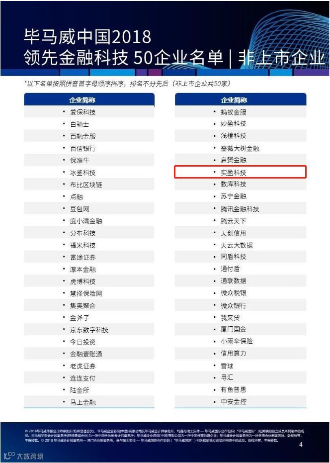 在毕马威(KPMG)中国2018领先金融科技50强评选中,实盈科技与蚂蚁金服、腾讯金融科技、度小满金融、京东数字科技等行业龙头企业并肩站在了领奖台,证明了我们的科技实力不容小觑。