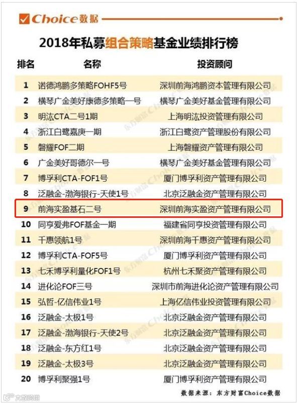 在2018年东方财富发布的中国私募基金业绩排行榜上,我们的前海实盈基石二号荣获组合策略类排名第九的好成绩。