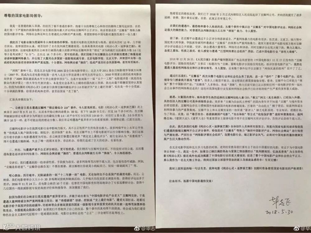 显然,毕志飞没有预料到这样的情况。他在惊惶失措中给豆瓣发了一份交涉函,写道:“一个青年导演花十二年心血认认真真给中国拍电影,被豆瓣一天毁了。”并配上了八个感叹号,以示愤怒。